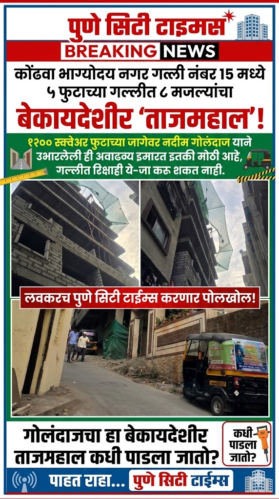 पुणे: कोंढवा भागात बेकायदेशीर बांधकामांवर महापालिकेकडून कारवाईचा बडगा उगारला जात असतानाच, काही विशिष्ट बांधकामांकडे अधिकारी सोयीस्कर दुर्लक्ष करत असल्याचा खळबळजनक आरोप करताच कोंढव्यातील शिवनेरी नगर, गल्ली नंबर १ मधील एका अरुंद बोळात जाफर पठाण नावाच्या बिल्डरने तब्बल ९ मजल्यांची बेकायदेशीर बांधलेल्या इमारतीवर पुणे महानगर पालिकेने कारवाई केल्याने बेकायदेशीर बांधकामांवर करणाऱ्यांच्या गोठ्यात खळबळ उडाली आहे.